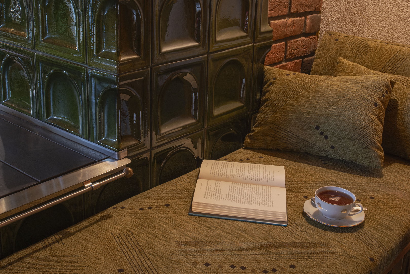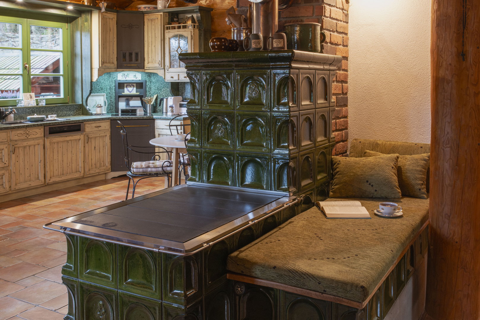 - zelená kachlová kamna s prostorem na ležení za kamny